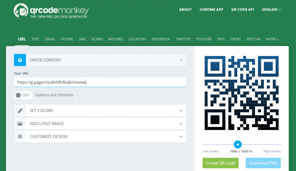 Now lets visit the QR Code Monkey website and create a free code. Once the page loads begin by filling in the “Your URL” section, paste your Google Review Link into this field as below;