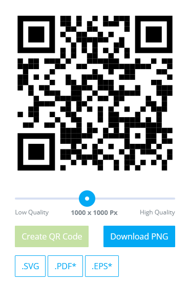 You may now press the green button on the right hand side of the screen “Create QR Code”, the default size of 1000 x 1000 pixels is perfect.